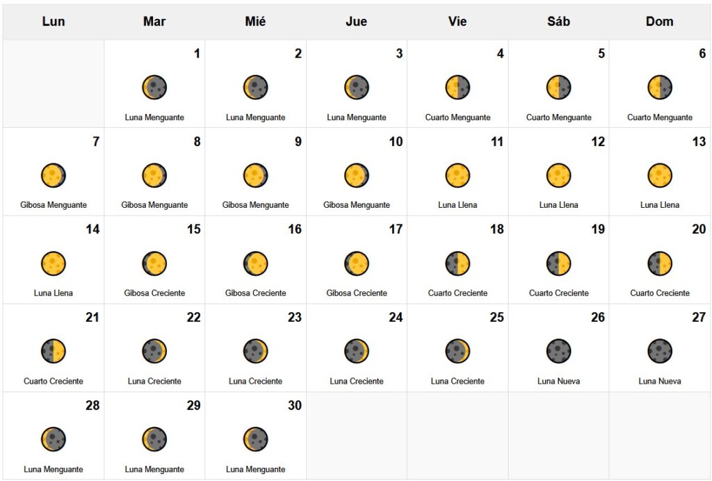 • Luna Menguante: 1, 2, 3, 28, 29, 30