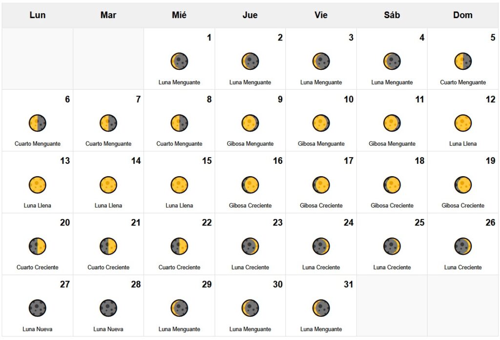 1 🌘 Luna Menguante | 2 🌘 Luna Menguante | 3 🌘 Luna Menguante | 4 🌘 Luna Menguante | 5 🌗 Cuarto Menguante | ||