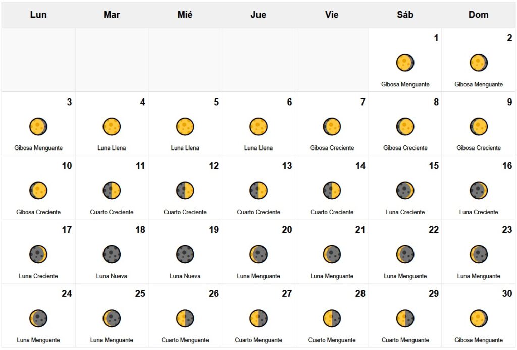 3 🌖 Gibosa Menguante | 4 🌕 Luna Llena | 5 🌕 Luna Llena | 6 🌕 Luna Llena | 7 🌔 Gibosa Creciente | 8 🌔 Gibosa Creciente | 9 🌔 Gibosa Creciente |