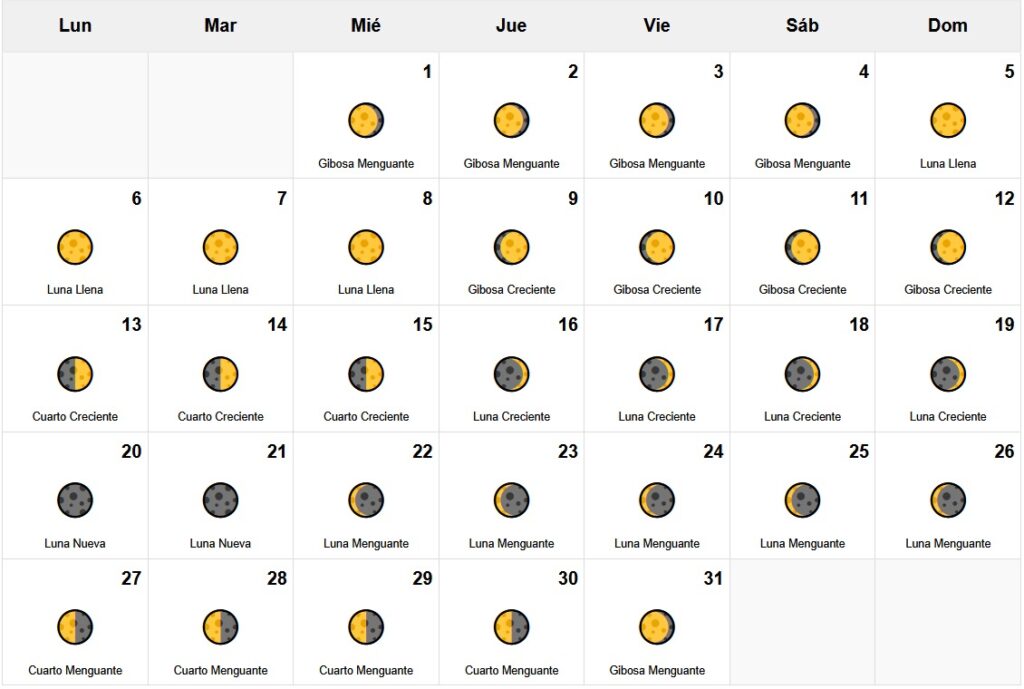 27 🌗 Cuarto Menguante | 28 🌗 Cuarto Menguante | 29 🌗 Cuarto Menguante | 30 🌗 Cuarto Menguante | 31 🌖 Gibosa Menguante |