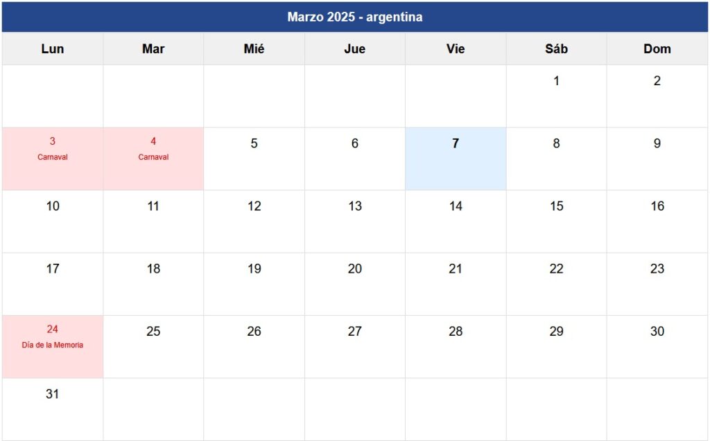 Descargar o imprimir Calendario Marzo 2025 Argentina en PDF o como imagen